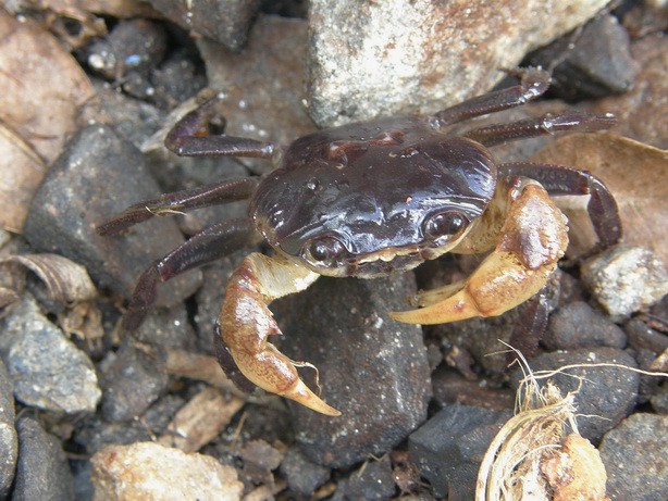 Пока Гена спускался вниз, я наблюдала за зверьком, который бегал среди валунов и травы под водопадом. Это был такой же зверёк, что и у пещеры, похожий на лису (может панда). У водопада живут пресноводные крабы.