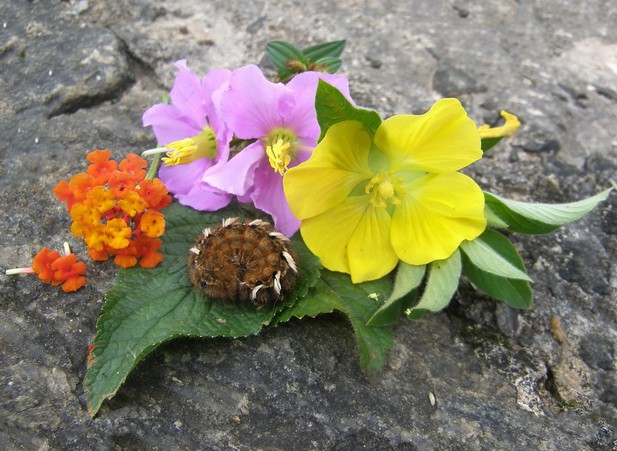 Здесь цвели кустики с ярко жёлтыми атласными цветами, ползали улитки с большими конусообразными ракушками. Сфотографировали несколько красивых гусениц.