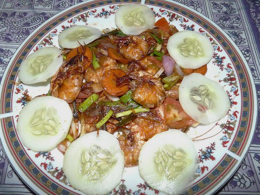 В гостинице заказали креветок. Принесли огромное блюдо с жаренными креветками в панцире под соусом с овощами.