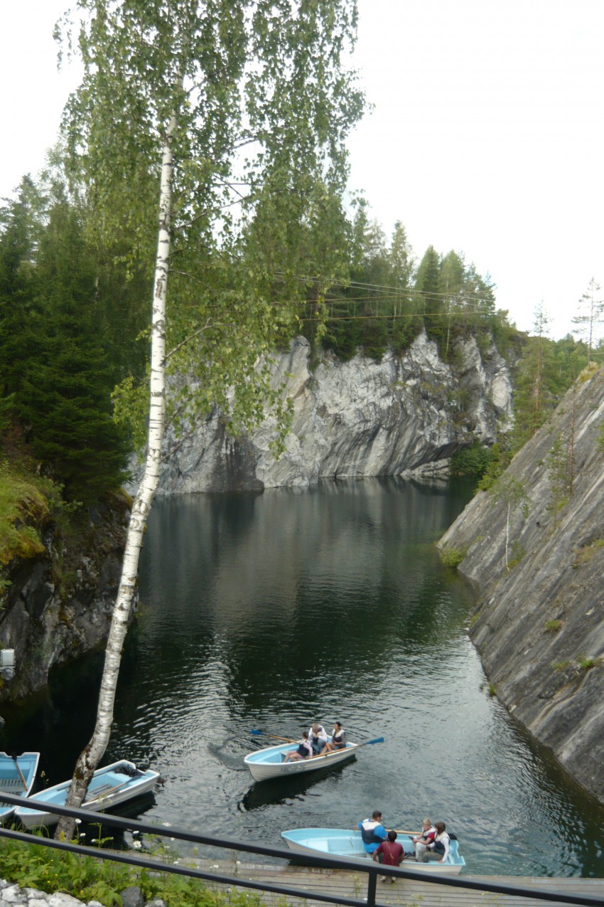 Мрамор этих мест уникален по цветовой гамме и красоте. Первыми его здесь добывать начали шведы. Потом по указу Екатерины — 2 отсюда начали возить мрамор на строительство в Санкт-Петербурге. В конце 30 годов прошлого века каньон затопили. Сейчас здесь раскрученный, достаточно хорошо оборудованный экскурсионный объект. Можно взять лодочку напрокат и самому покататься по всему каньону, что мы и сделали, еще и устроив гонку со сломанными веслами.