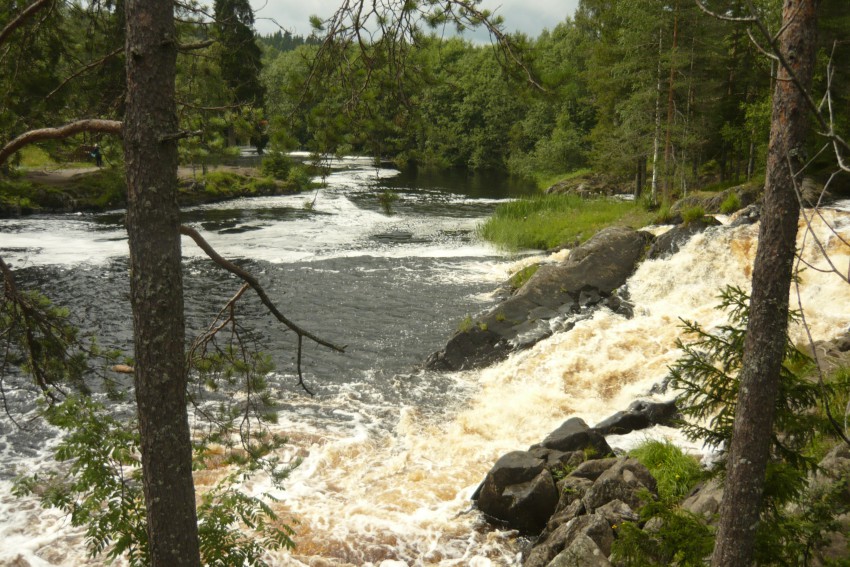 Он расположен в заповеднике на реке Суна. Высота водопада 11 метров, имеет несколько перепадов. Вода коричневого цвета из-за торфяных залежей. Удивило громадное количество туристов в этих отдаленных местах.