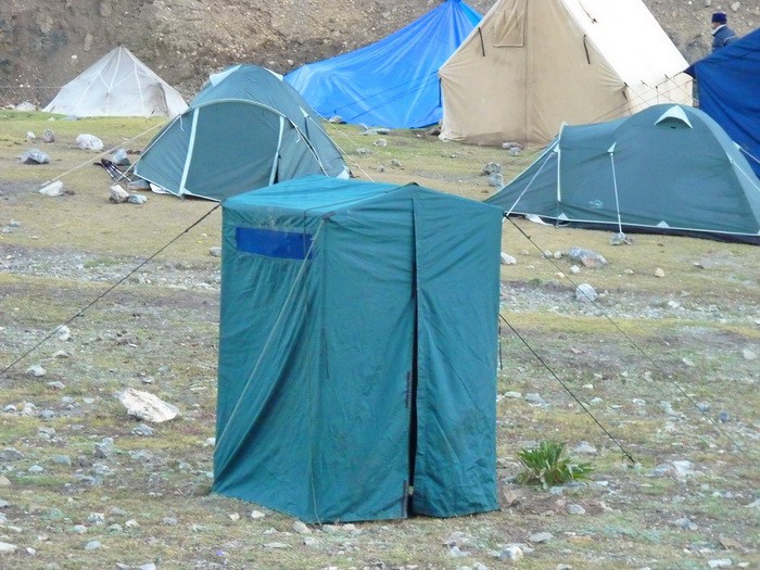 Французская группа туристов, разбив свой лагерь на небольшой зелёной полянке рядом с нами, не забыла поставит свой личный туалет, который специально везла из своей страны! Вот это забота об экологии! И не важно, что не всем в нём хватало место. Главное отношение к Природе.