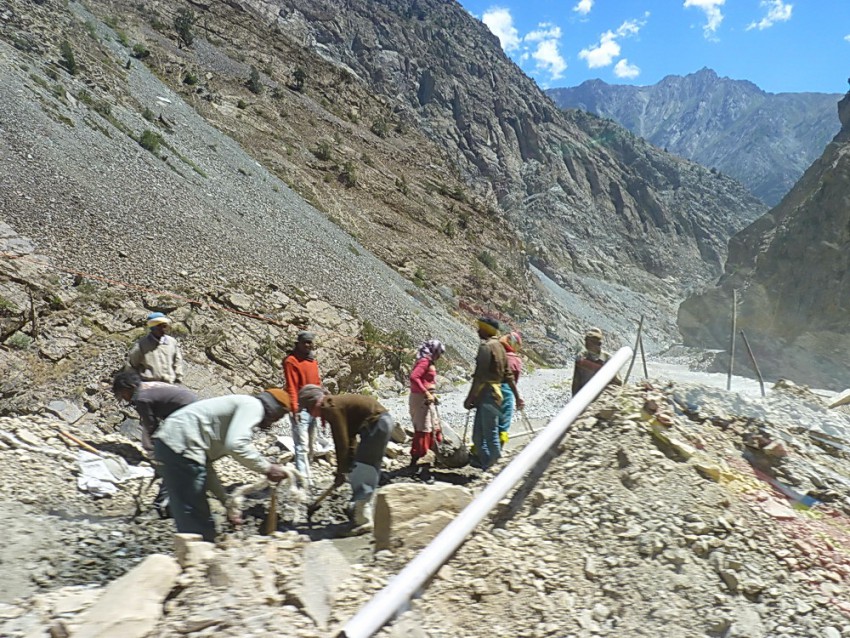 В одном месте попадаем в пыльную бурю от работающего бульдозера, расчищающего дорогу от упавших огромных камней. Мы все в пыли как рабочие цементного завода. Но, в основном, здесь применяется ручной труд тысяч и тысяч индусов.