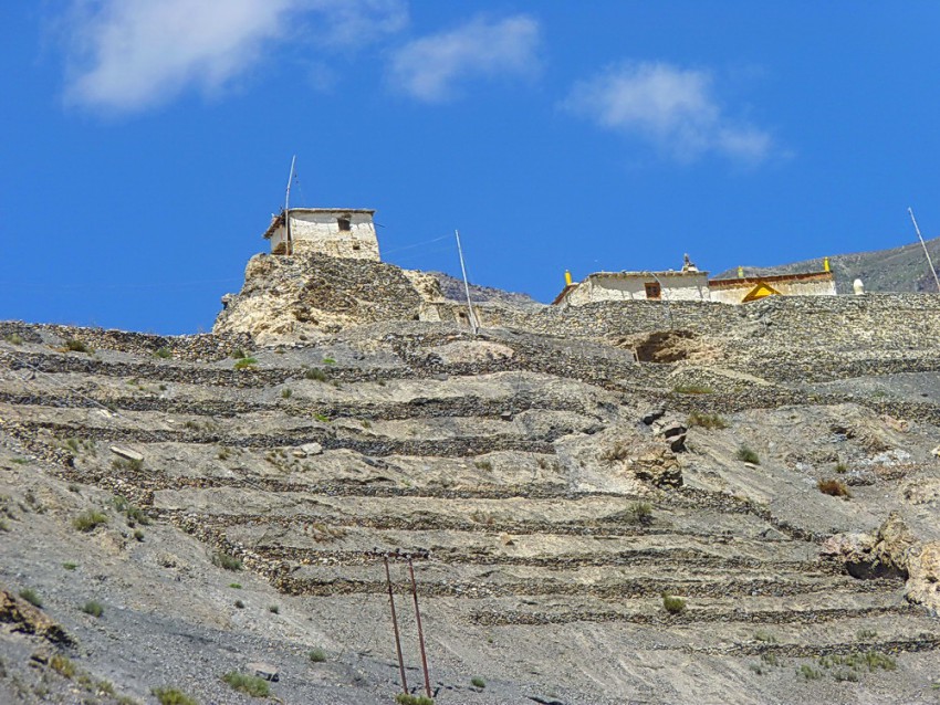 Проходим крохотные поля местных жителей и спускаемся круто вниз в живописное ущелье.