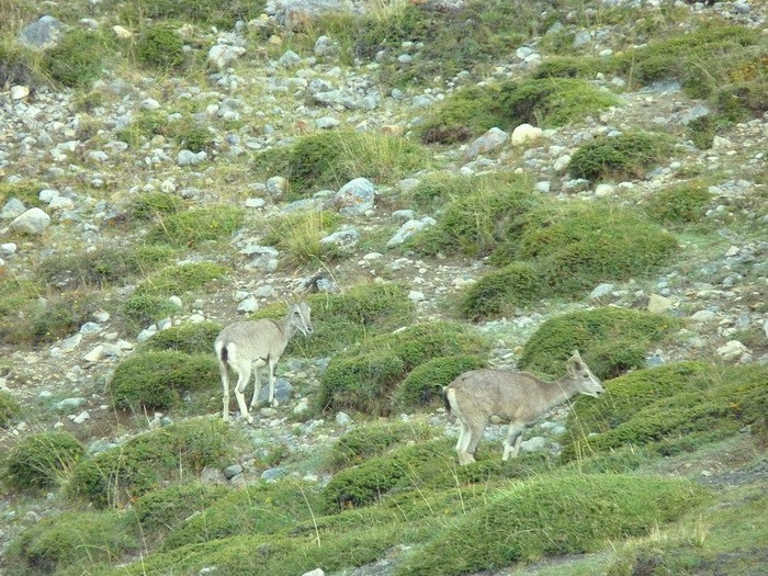 Невдалеке, на зелёной лужайке под вечер пасутся какие-то гималайские дикие животные. На вид — олени.