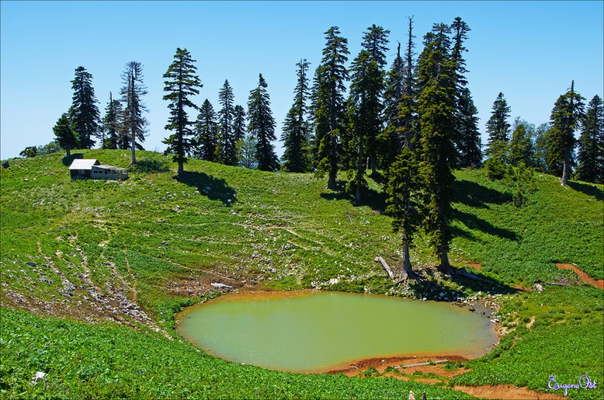 Небольшое озеро служащее так же водопоем для пасущегося здесь всё лето скота