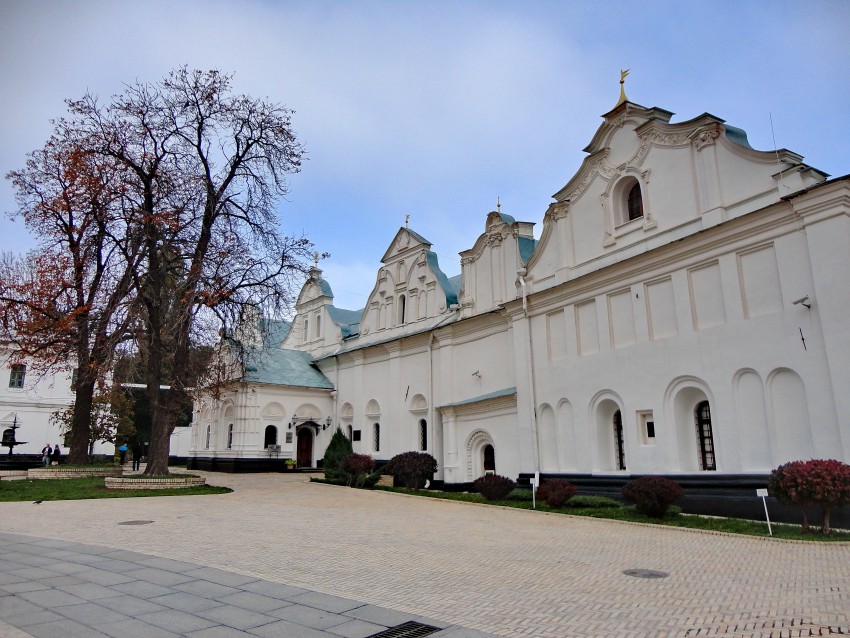 Выйдя из галереи на площадь у Дальних пещер, мы увидим возвышающийся на холме величественный храм в стиле украинского барокко — церковь Рождества Пресвятой Богородицы.