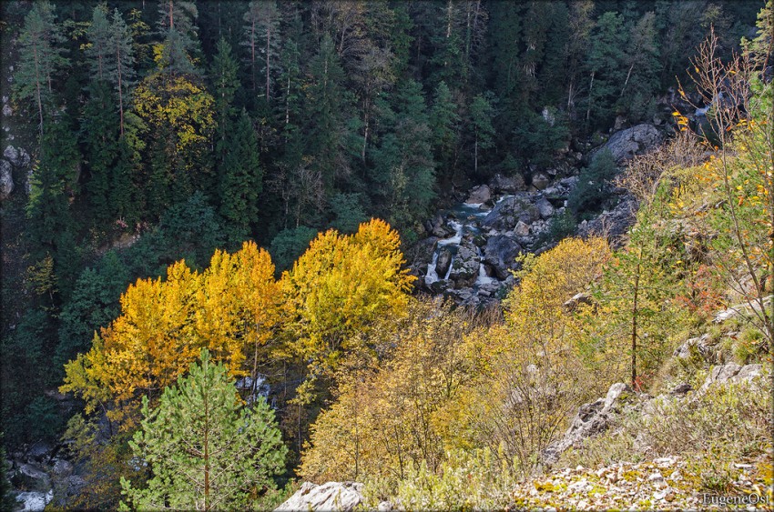 В окружении осенних красок мы достигаем конечной цели нашего путешествия — вот он Гегский (Черкесский) водопад выглядывает из-за деревьев