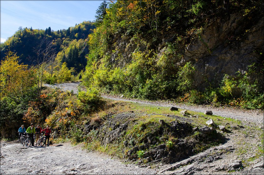 В общем спуск прошёл удачно и теперь можно надавить на педали по ровному асфальту до места встречи с водителем у слияния Геги и Бзыби.