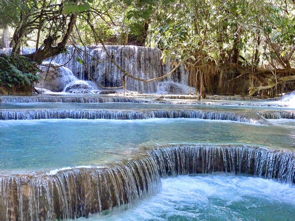 Любуясь цветами подошли к реке Куанг-Си, на которой множество травертинов, порогов и водопадов.