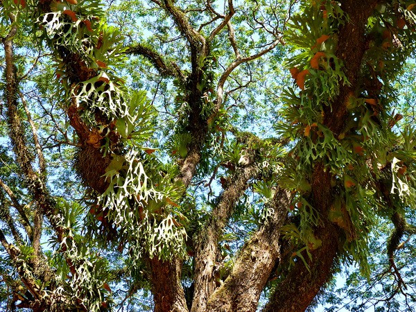 На гигантских деревьях растут папоротники и отдыхают туристы.