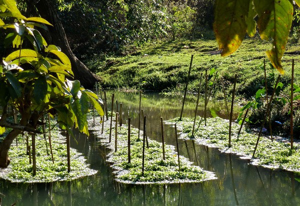 Водяные грядки чтобы не уплыли, укреплены палками. На грядках растёт кресс-салат (цицмат) и другая зелень.