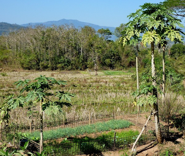 Прошли тиковый лес. Это дерево быстро растёт, поэтому его древесина широко применяется. Плантации тика встречаются очень часто по всему Лаосу.