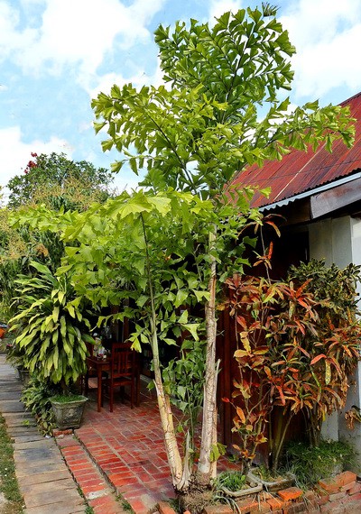 Слева на фото высокий куст имбиря возвышается над забором и закрывает часть дома.