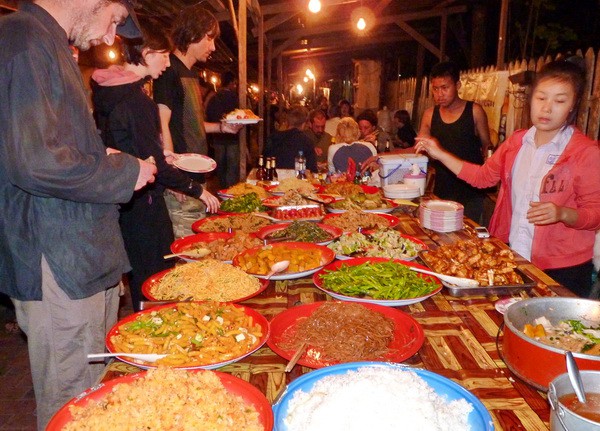 Переправившись на наш берег мы отправились ужинать. В Луанг-Прабанге есть целая улица, на которой вечером накрывают столы. Здесь можно взять тарелку и с разных огромных блюд положить всего чего душе угодно (рис, макороны, лапшу, тушёные овощи, грибы, рыбу) сколько поместится в тарелку. Одна такая тарелка с едой стоит 30 рублей.