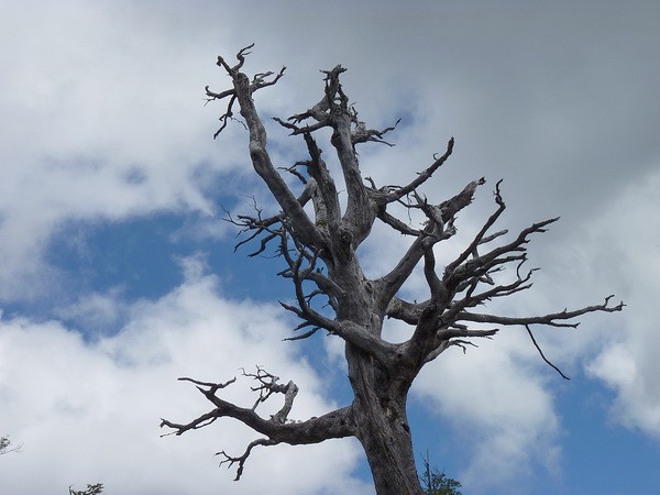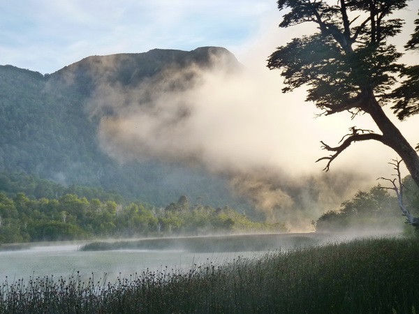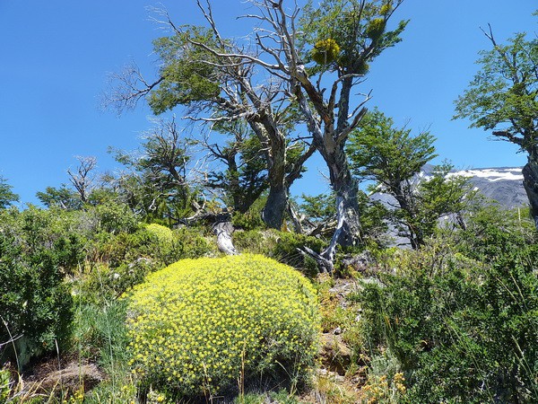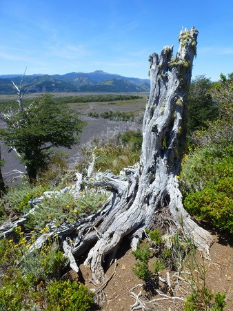Растительность от вечнозелёной буквально за поворотом меняется на полное отсутствие листьев и корявые стволы. Обратите внимание на горы мышиного цвета ( фото ниже). Оказывается причиной всему являются извержения вулкана, находящегося в Аргентине. Ветер дует в Чили. Огромное количество пепла оседает на горах, меняя их цвет. Деревья гибнут.