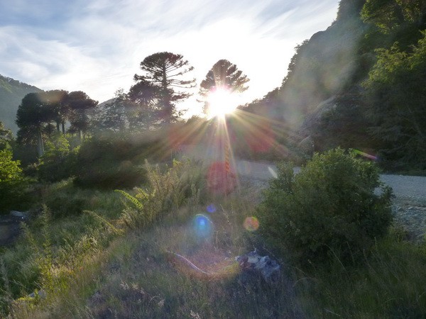 Ознакомившись столь подробно с этим вулканом, мы поехали дальше. Под вечер доехали до маленького населённого пункта, последнего перед границей с Аргентиной. Расположенный на берегу реки, он был окружён красивыми скалами и назывался Puesko.