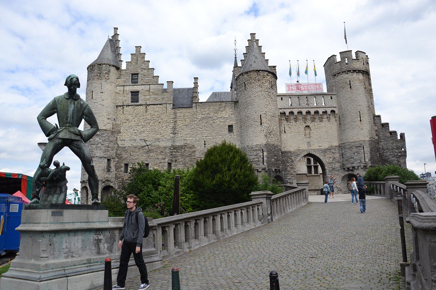 Наша экскурсия началась с замка Стен, выстроенного в 1520г. на берегу реки Шельды. Ныне в его стенах находится Национальный морской музей. В 1963 году перед входом в замок был поставлен памятник Долговязому Вапперу, персонажу антверпенского фольклора, который, превращаясь то в карлика, то в великана, пугал непослушных детей и сбившихся с дороги пьянчуг.