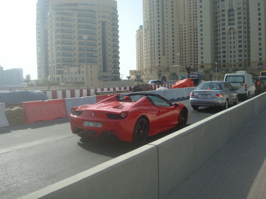 Таких красоток здесь не счесть. Lamborghini, Ferrari, Maserati, а порою и Bugatti. Я уже не заикаюсь про Bentley, Chevrolt Camaro, Mustang, Rolce Royce и т.д. Обратите внимание на количество цифр на номере авто. Количество цифр в номере зависит от статуса человека и сам номер закрепляется не за авто, а за владельцем. 1 цифра в номере — значит шейх. Всего их семь (сколько эмират, столько и шейхов). 2 цифры — родственники шейха. 3 — прочие привилегированные персоны. 4 — богатые люди. 5 — все остальные. Посмотрите на фото машин и вы поймете, что даже «все остальные» в ОАЭ могут позволить себе ездить, скажем на Ferrari. На таких машинах катаются преимущественно арабы, так как страна для их богатства делает все. На одной и той же должности в одной и той же компании араб будет получать больше денег, чем, допустим, американец, англичанин или кто-нибудь иной. Хотя, такое ощущение, что арабы здесь и вовсе не работают. В ОАЭ четко разграничены ставки зарплат в зависимости от твоей национальности. Больше всех получают арабы, затем американцы и англичане, египтяне. В самом низу стоят индусы, а вот перед ними, как бы обидно нам ни было, идут русские и уроженцы СНГ. Именно поэтому на стройках можно увидеть только индусов (а строительство там идет полным ходом почти во всех районах):