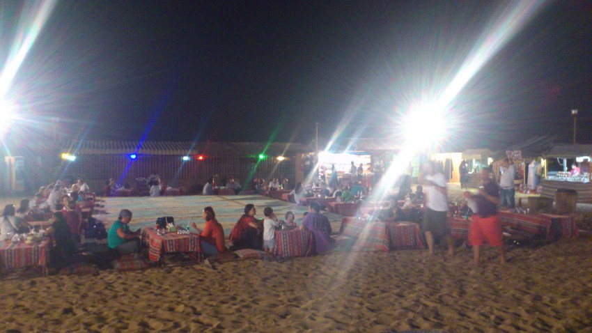 По окончанию гонок по пескам, вас отвезут в лагерь, где будет предложено отведать кальян, нарисовать татуировку из хны (правда рисуют только скорпиона и непонятный узор, на это выбор заканчивается), покататься на верблюдах, квадроциклах, вкусно поесть (очень вкусный шведский стол. Вообще еда у них мне понравилась вся). В концовке вечера вам покажут шоу танец мужика в тяжелой юбке и, конечно же, танец живота. Сам лагерь выглядит вот так: