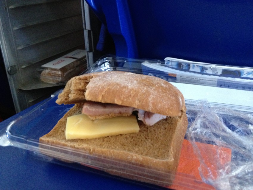Расстояние между сиденьями широкое, даже высокому человеку будет куда вытянуть ноги. В услугах на рейсе есть меню закусок и напитков за доп плату. Цены невысокие. Сэндвич — 120р., кофе — 80р.