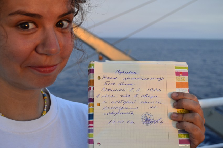 Справка о том, что ей позволено не разговаривать лишний раз. Выдана штатным доктором «Крузенштерна»