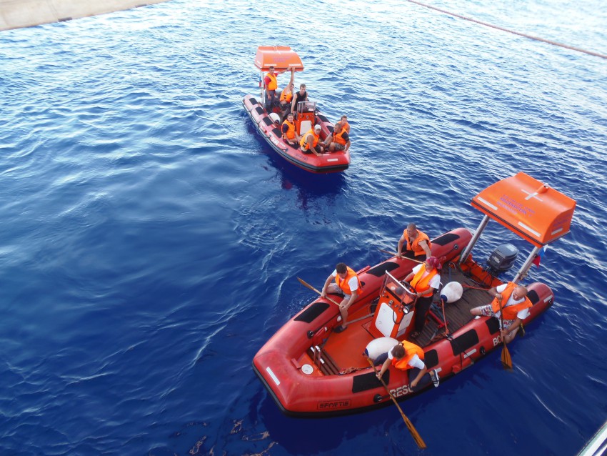 Прошли учебную тревогу по покиданию судна. У каждого человека в кубрике есть надкоечное расписание. Где указаны все тревоги, сигналы и принимаемые меры. Так же указан номер спасательной шлюпки. На борту мест в шлюпках ровно вдвое больше чем пассажиров.Каждый борт может взять всех. Разделенные по бортам пополам. В зависимости от крена при крушении, используется тот или иной борт.