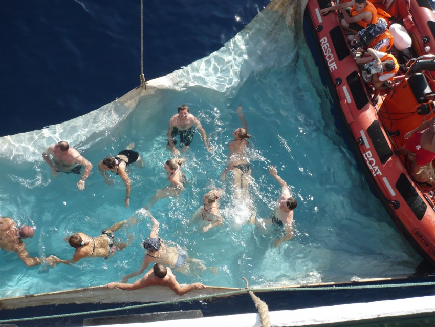 Следующий день, пока хорошая погода снова опускают парус! Закрытие купального сезона и снова соревнование на воде. На этот раз не шуточное. Команда получает 4 весла и одного рулевого, шлюпку и вперед, вокруг барка на время! его длина 114метров, ширина 15м. складываем примерно 300м. Условия ветра, волны, неуправляемости шлюпки(она не для весел) и разность сил участников. девушек и парней. Сложно, исход сил и руки начинают отваливаться.