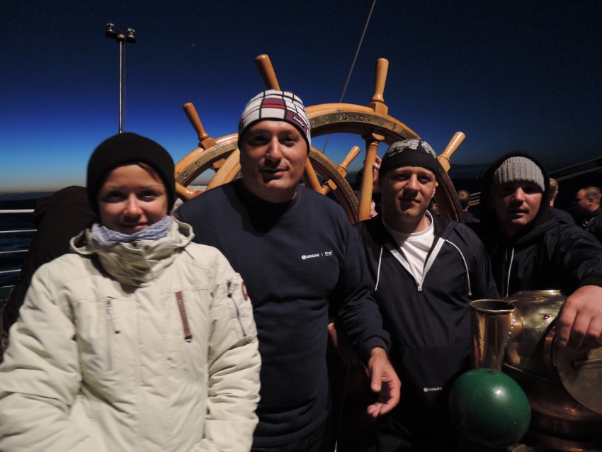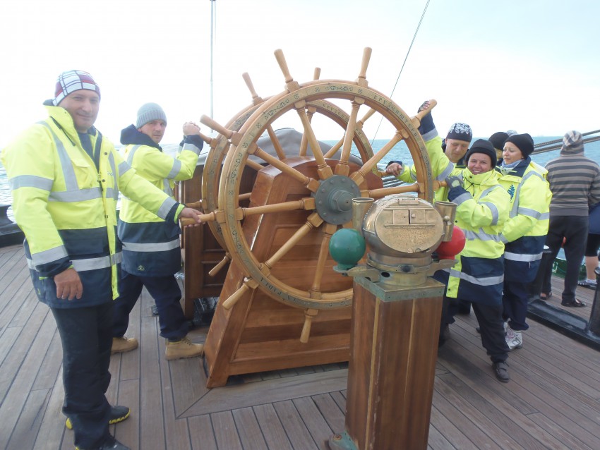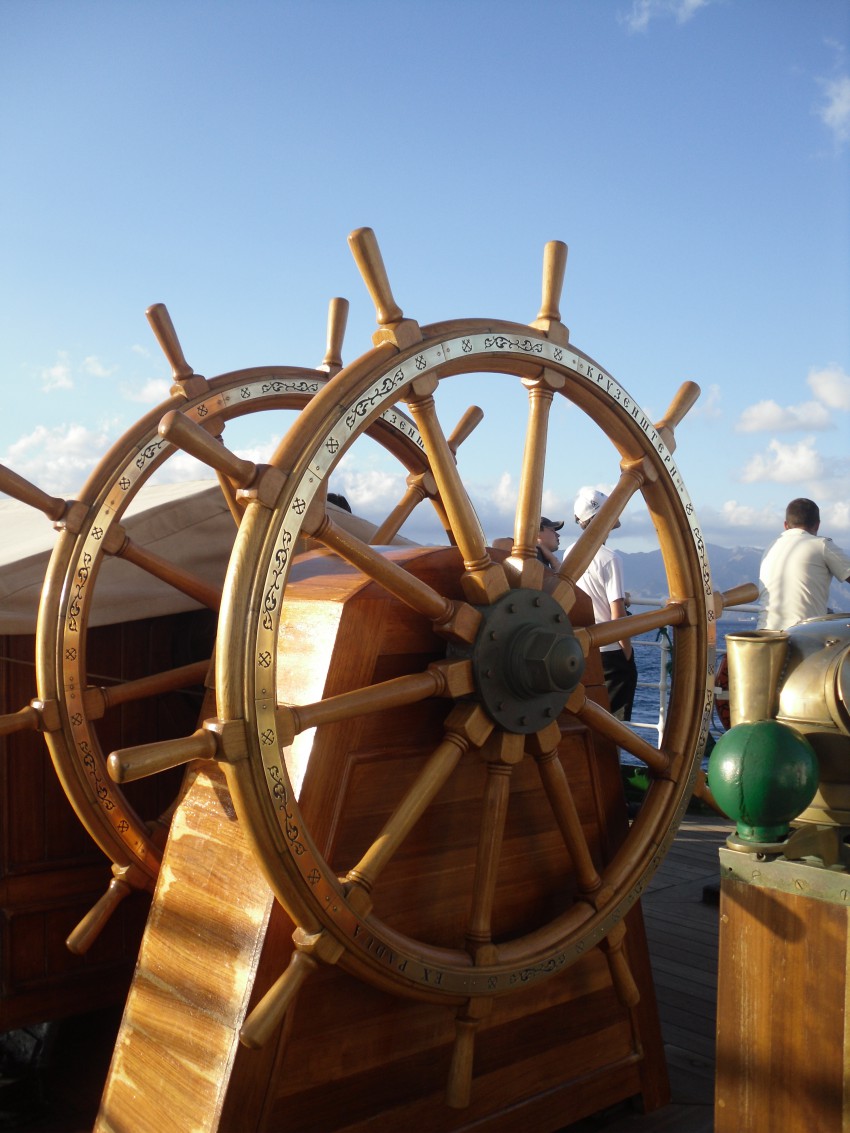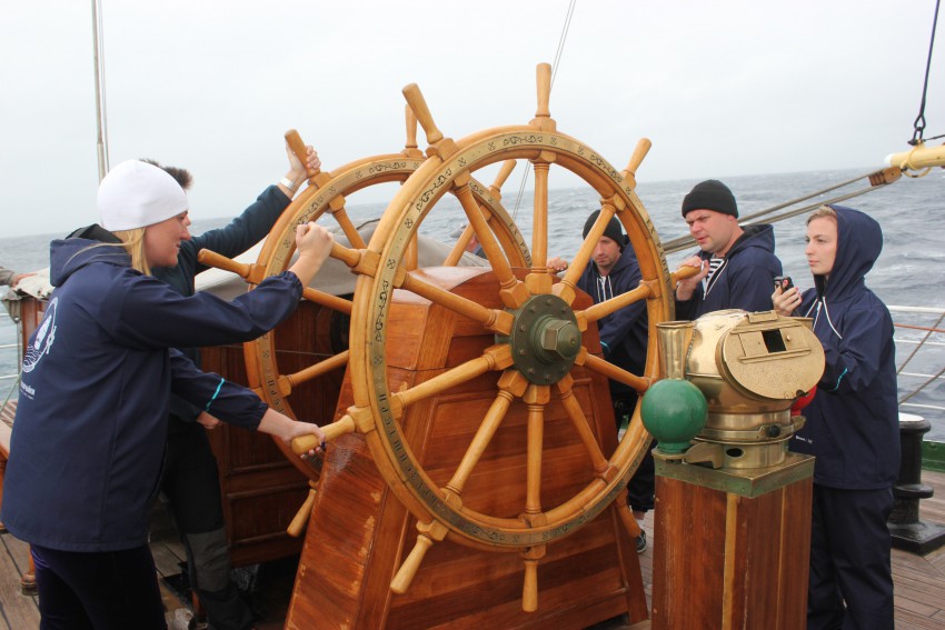 Самый ответственный, долгожданный и действительно требующий концентрации конкурс. Даже сложно назвать конкурсом. Вахта! Четыре часа, каждая команда получила возможность управлять «Крузенштерном» старинным способом, штурвалом!