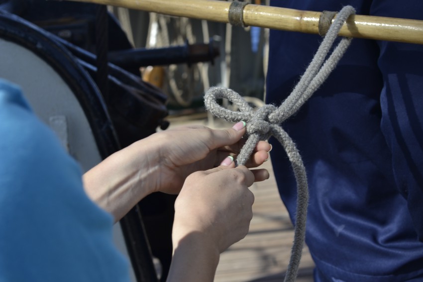 Учились мы вязать и узлы морские. Обучением занимались боцмана. Показали несколько раз как это делается. 5 узлов. Удавка, шкотовый, выбленичный, калмытский и беседочный(завязывается на себе вокруг пояса). Два дня все ходили с веревочками и любую свободную минуту тратили на мастерство вязки узлов. На скорость. Делились секретами скорости и ловкости!