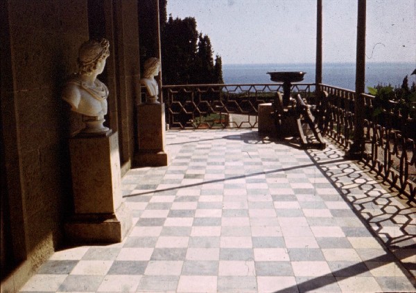 Очередное фотопутешествие на четыре десятилетия назад: дворцовое поместье российского графа Воронцова в Алупке — знаковая достопримечательность Южного берега Крыма. Дворец окружает великолепный парк, несколько фотоснимков которого здесь уже размещались. Место для дворцового комплекса замечательное — на фоне соснового леса, горного массива и зубчатой вершины Ай-Петри.