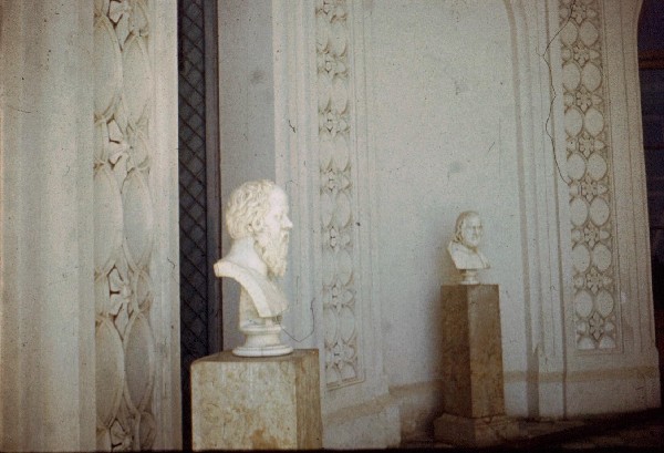 Главный вход и галерея вокруг основного здания насыщена скульптурными коллекциями бюстов — копий классики и портретов современников графа.