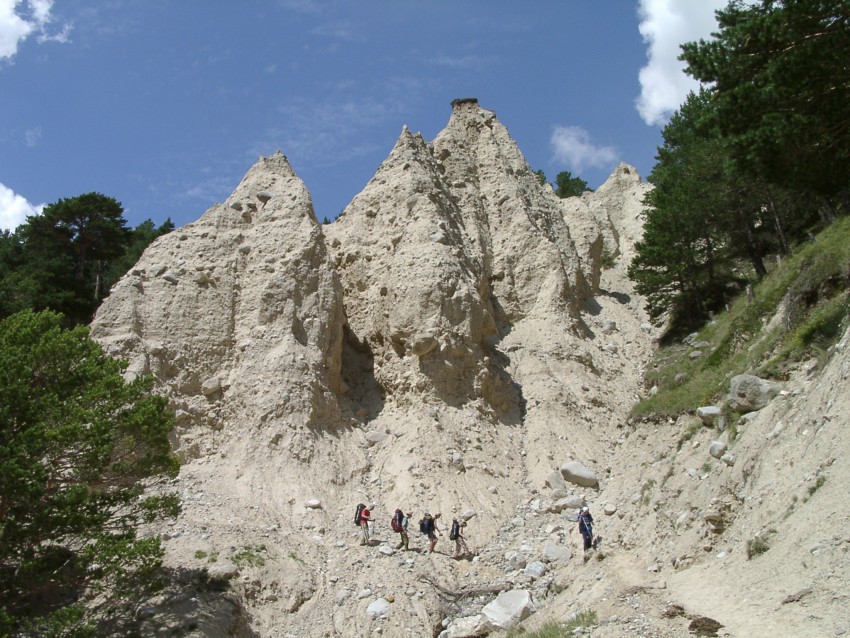Проходим «грибы» и тропа выполаживается. Идём через сосновые леса с альпийскими полянами.