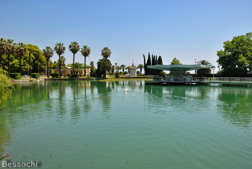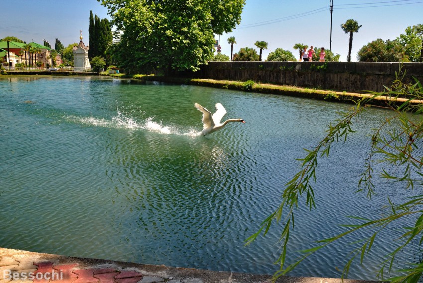 Дальше мы пойдем посмотрим городской парк, как раз распогодилось и вышло солнышко, самое время прогуляться. Через парк проходит уже известная нам река Псырцха, в период оттепелей она становилась полноводной и затапливала большие участки. Обустроившиеся в этих местах монахи под руководством талантливого человека отца Иерона, не имевшего инженерного образования, наладили сложную гидротехническую систему. Река Псырцха проходит через всю систему ограждений, водопадов, прудов и попадает в нижний пруд, где монахи разбили великолепный Новоафонский парк.
