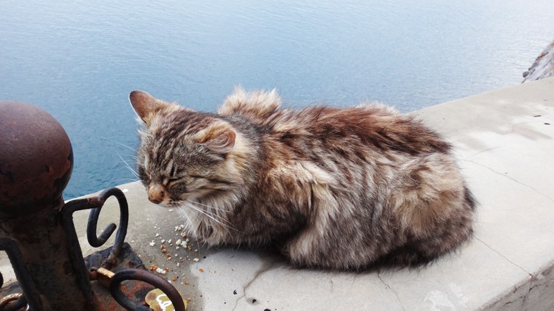 Невесть откуда взявшийся здесь кот, спокойно спит на высоте 100 метров, иногда открывая один глаз и наблюдая за чайкой сидящей от него в 5-ти метрах. Представляю что будет, если кот сиганет за ней и промажет...)