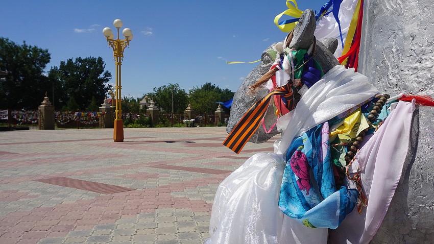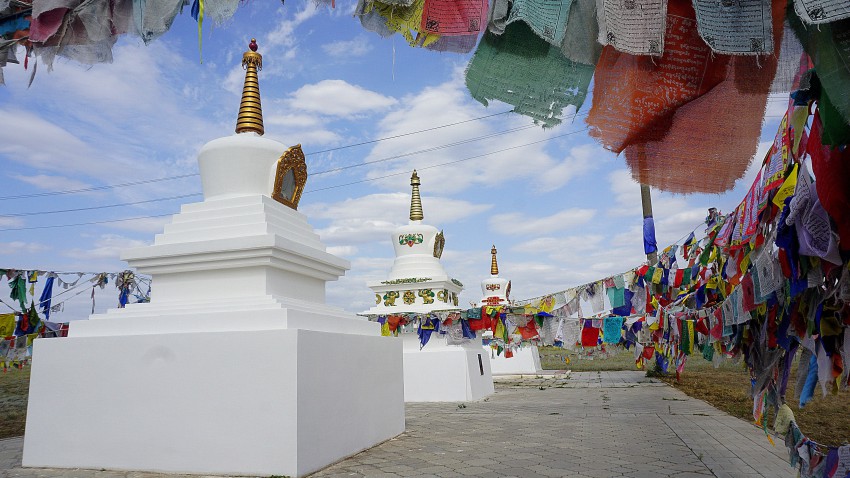 Мы подходим к трем ступам, в одной из которых покоится прах последнего Санджи-ламы. Они обособленно стоят в стороне от аллеи, оплетенные тысячами молитвенных флажков, ленточек четырех цветов ( это четыре калмыцких рода) и пением цикад. Обходя их трижды, принято загадывать желания.