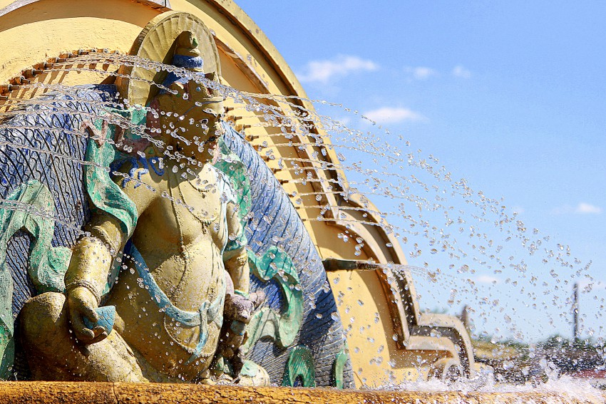 За статуей следуют две лестницы, меж которых находится фонтан, на вершине которого восседает божество богатства по имени Кубера.
