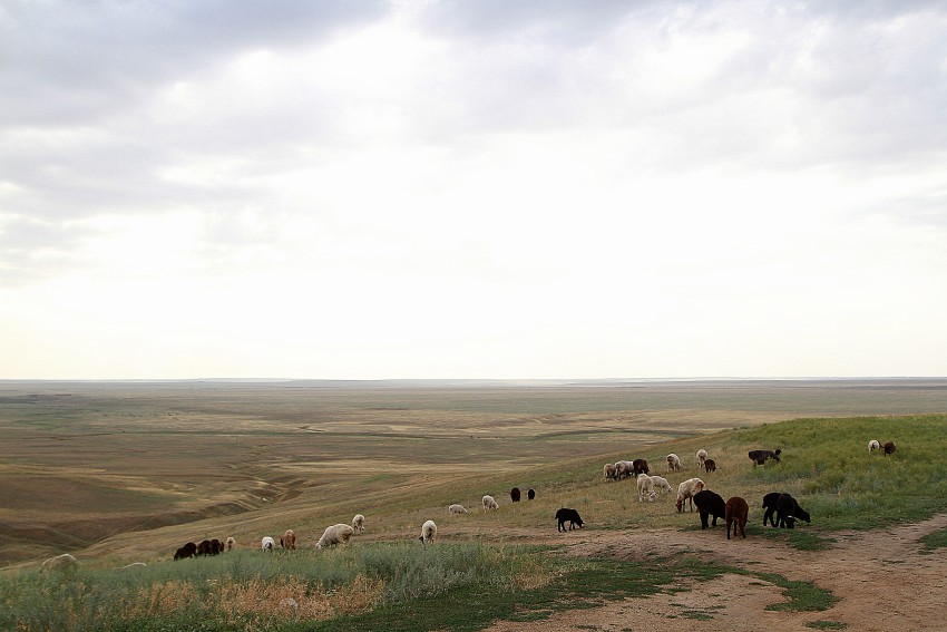 Мы останавливаемся. Ветер, шум ветвей… Большое стадо овец привольно бродит по зеленеющей степи среди ступ.