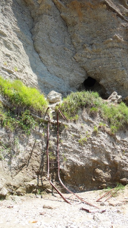 Через метро 40 началось понижение и сужение тоннеля и подумалось, что это всё, но пробравшись дальше полуползком, увидели небольшую железную лестницу для перехода через дыру на другой уровень