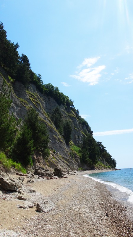 И даже не в этом дело. Идти нужно не только по берегу камешкам-песочку, а постоянно перелезая через нагромождения каменных глыб. Конечно, интересней, но утомительно.