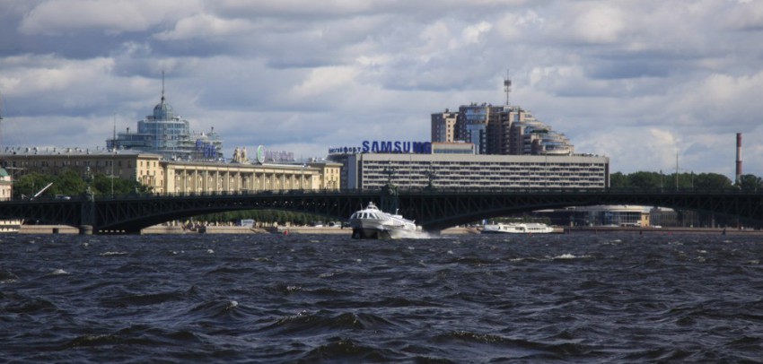 Еще один вид на Санкт-Петербург с воды и тут же Метеор. Внешне очень похож на наши Кометы, но куда менее мореходен, так-как не рассчитан на морскую штормовую волну. Они, как правило, ходят до Петергофа через Финский залив. Это самые быстрые суда на реке. И еще они могут боком по воде валить. Своего-рода дрифтуют и это зрелище очень впечатляет.