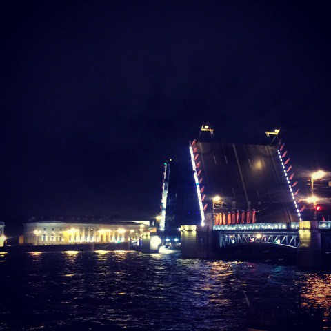 Разводной мост через Большую Неву в Санкт-Петербурге. На его местеранее был построен первый постоянный городской мост через Неву. Деревянный плашкоутный (наплавной) мост соединил берега реки вблизи этого места в 1727 году. А уже в 1843-1850 годах был сооружен постоянный чугунный арочный мост, которому было дано имя — «Благовещенский» и он является своеобразной границей начала Финского залива.