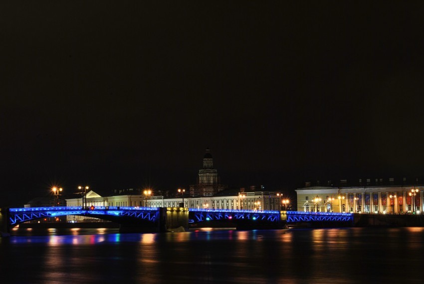 Загадочен и величественен ночной Петербург, окутанный таинственной дымкой. Полюбоваться белыми ночами, неоднократно даривших вдохновение многим известным художникам, поэтам и писателям — каждый год сюда приезжают многочисленные туристы со всего света. Но город становится не мене интересным и когда Невские берега окутывает тёмная ночь. Благодаря изумительной подсветке очень выразительно подчёркиваются строгие линии прекрасных парадных зданий, дворцов и мостов.