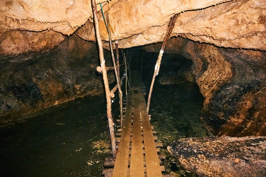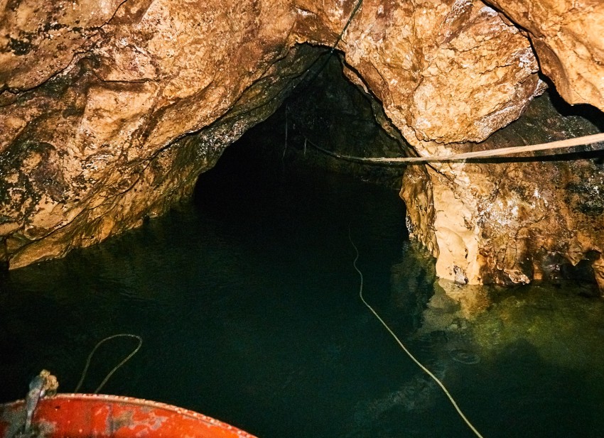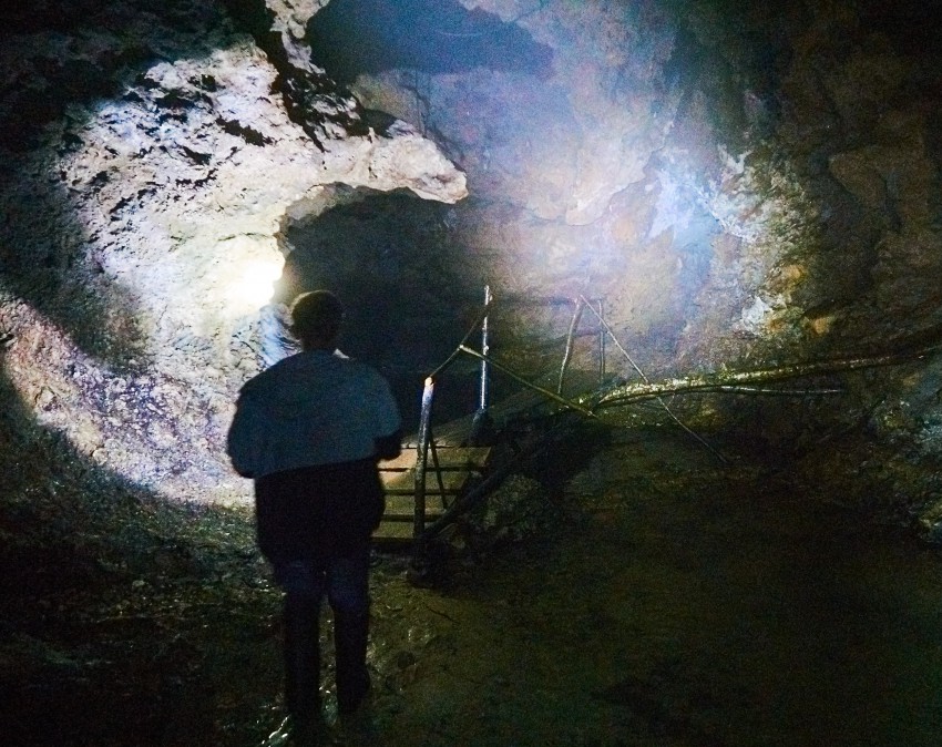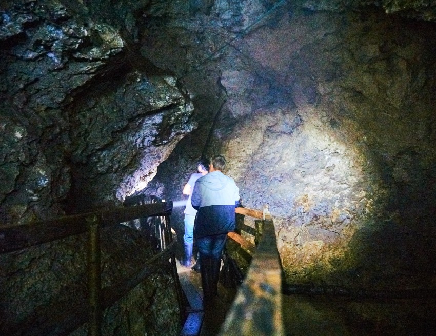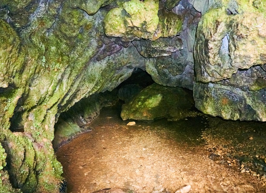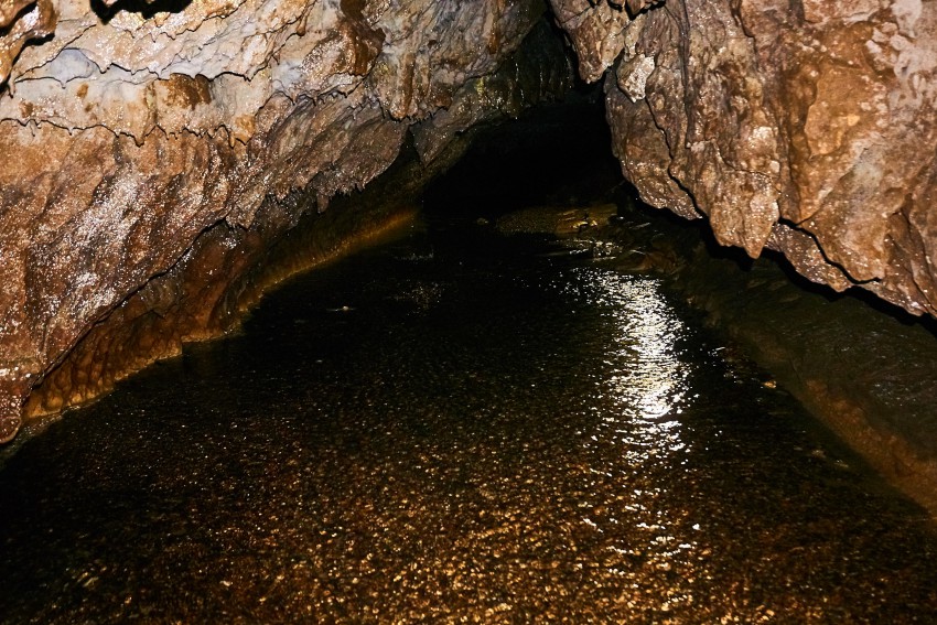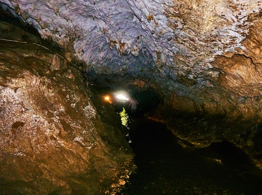 Здесь так же течет подземная речка, сапоги можно подобрать прямо на входе в пещеру.