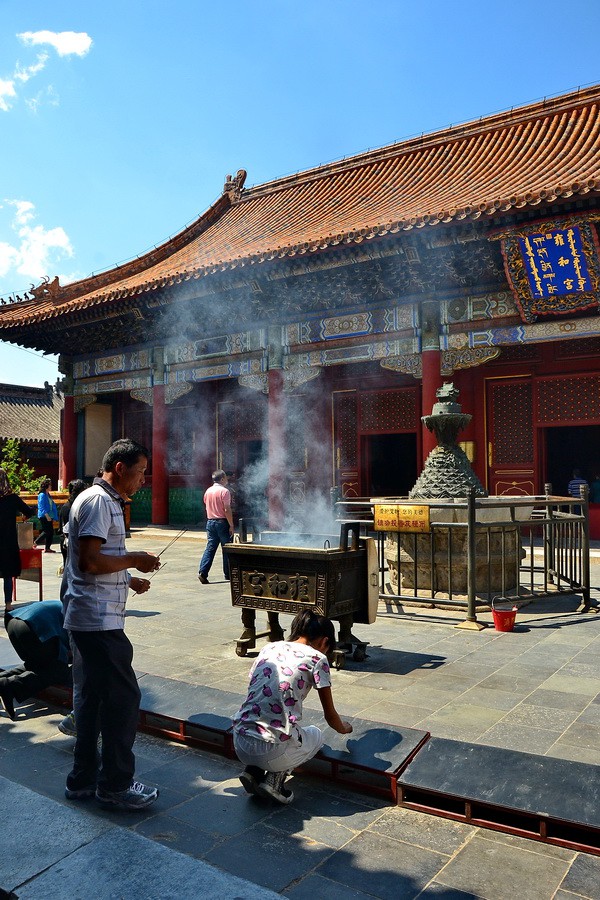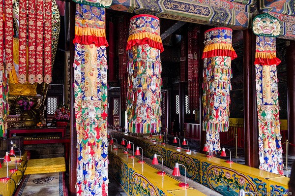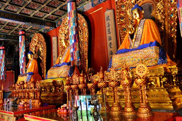 Зал Гармонии и Мира — центральная часть храма. В зале три бронзовые статуи Будд Трёх Времён, статуя Гаутамы Будды (Будды настоящего) в центре, рядом Будда Кашьяпа (Будда прошлого, справа) и Майтрейя (Будда будущего, слева).