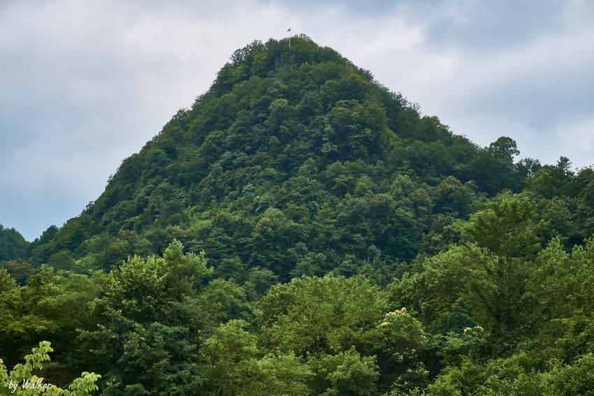 Дальше, по заросшей тропе поднялись на вершину горы, где стоял подсвеченный тремя прожекторами Абхазский флаг.