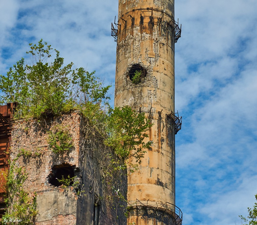 Въезжаем в город, который встречает нас огромными корпусами брошенных предприятий