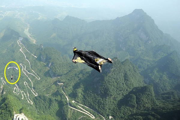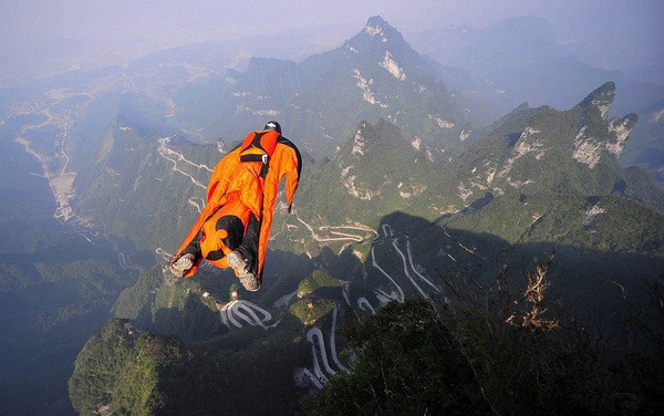 Участники в костюме-крыле прыгают с 700-метрового склона горы Тяньмэнь.
