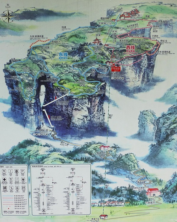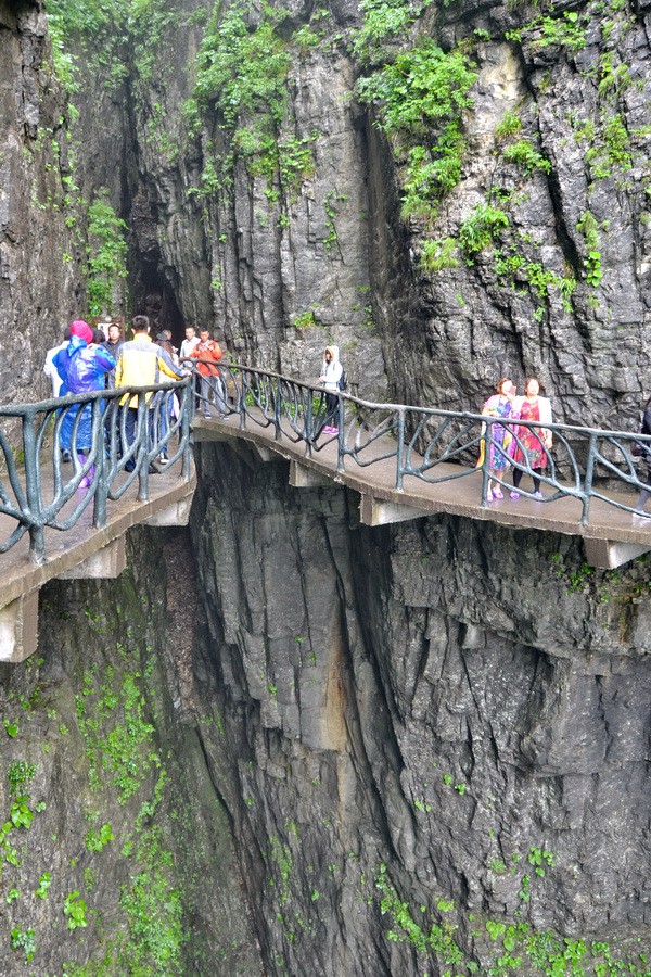 Небесные ворота очень высокие, поэтому в горе сделан длинный тоннель с несколькими линиями эскалаторов. Чтобы не скучно было спускаться, вдоль стен тоннеля расположили фотографии с видами горы Тяньмэнь.