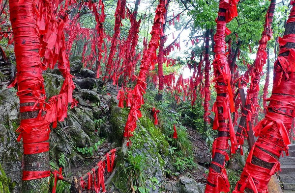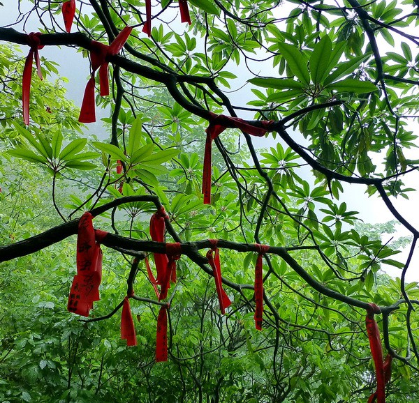 Здесь продают шёлковые красные ленточки. Люди пишут на них свои желания и привязывают к дереву. Т.к. китайцев оч.много, я думаю, что работники парка каждый день снимают эти ленточки, чтобы освободить веточки для новых желаний (плата за ленточки, служит оплатой работникам).